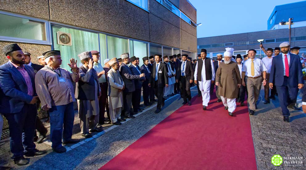 The Khalifa (Caliph) travelled from London by road and after crossing into Germany he was greeted by the National President of the Ahmadiyya Muslim Community in Germany, Abdullah Wagishauser and various other officials.