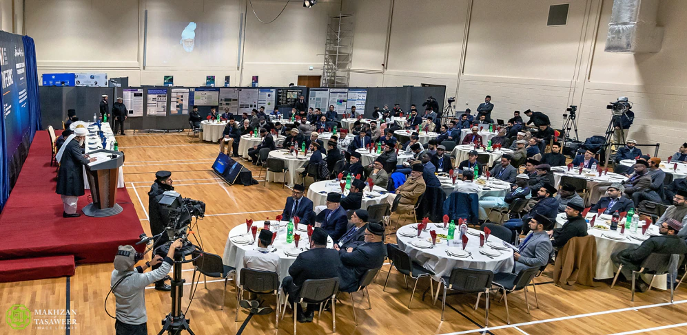 Der Oberhaupt der Ahmadiyya Muslim Jamaat hält eine Grundsatzrede auf der ersten internationalen Konferenz der Forschungsvereinigung